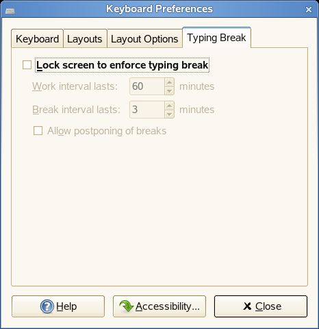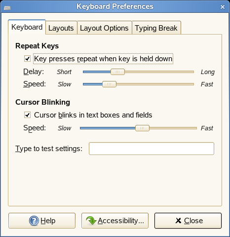 キーボードの初期設定は、自動繰り返し設定の変更およびタイピング休憩の設定に使用します。