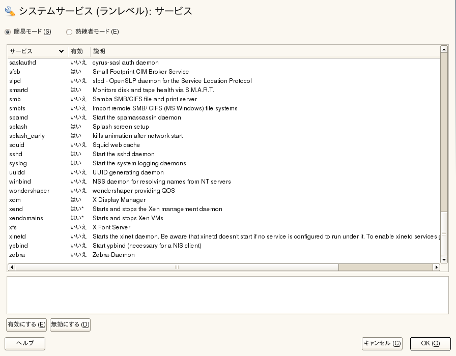 の順に選択して、このYaST moduleを起動すると、利用可能なすべてのサービスの概要と、各サービスの現在のステータス(有効か無効か)が表示されます。モジュールをとのどちらで使用するかを決定します。ほとんどの場合、デフォルトので十分です。左の列にはサービスの名前が、中央の列にはその現在のステータスが、右の列には簡単な説明が表示されます。ウィンドウの下部には、選択したサービスについての詳細な説明が表示されます。サービスを有効にするには、表でそれを選択し、を選択します。同じ手順で、サービスを無効にできます。