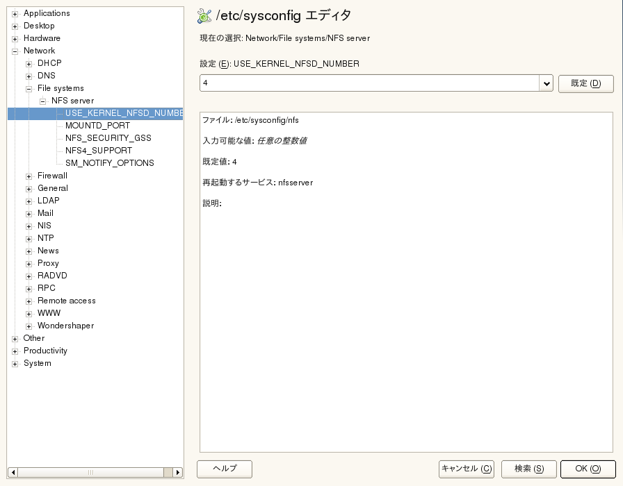 YaSTのsysconfigエディタは、使いやすいシステム設定のフロントエンドです。変更する必要のある設定用変数の実際の場所が分からなくても、このモジュールに内蔵された検索機能を使うだけで、必要に応じて設定用変数の値を変更できますし、これらの変更の適用、sysconfigで設定されている値に基づく設定の更新、サービスのリスタートは、YaSTが行います。