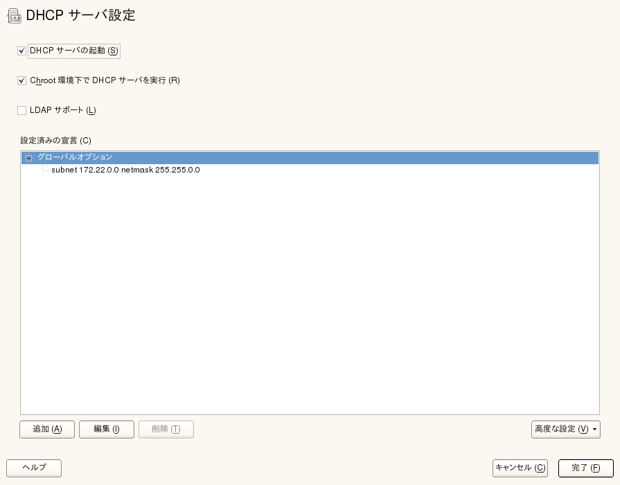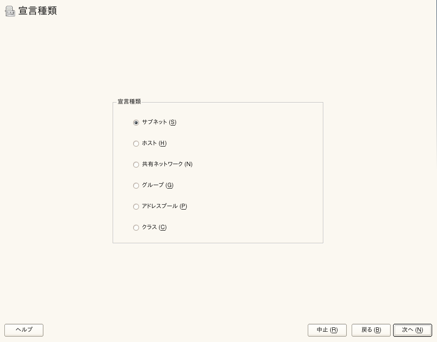 この最初のダイアログで[]を選択し、既存の環境設定を編集可能にします。DHCPサーバの動作のうち、重要なのはchroot環境またはchroot jailで動作してサーバホストを保護する機能です。DHCPサーバが外部からの攻撃にさらされるとしても、攻撃者はchroot jailの中にとどまるためシステムの残りの部分には進入できません。ダイアログの下部には、定義済みの宣言を示すツリービューが表示されます。これらの修正には、[]、[]、および[]を使用します。[]を選択すると、上級者用のダイアログが追加表示されます。参照先 図 22-6. を選択後、追加する宣言の種類を定義します。から、サーバのログファイルの表示、TSIGキー管理の設定、およびDHCPサーバのセットアップに応じたファイアウォール設定の調整を行うことができます。