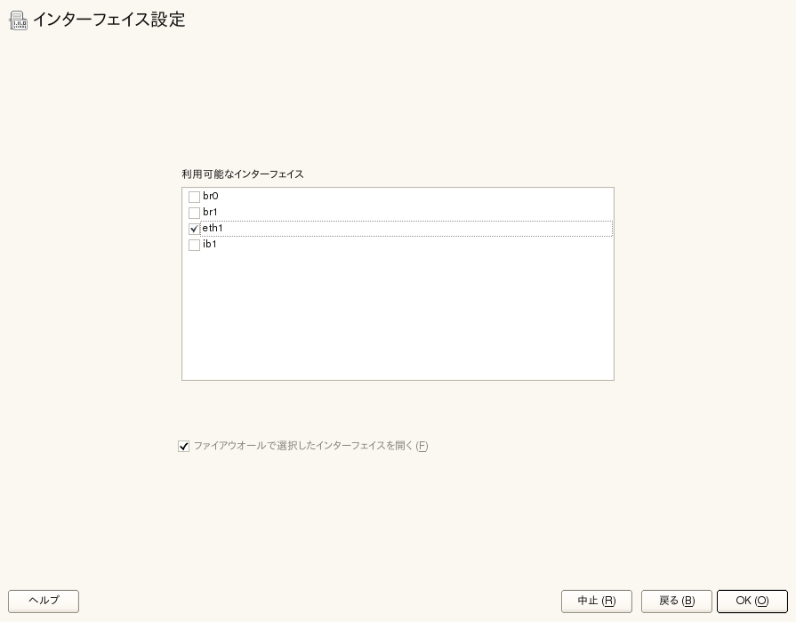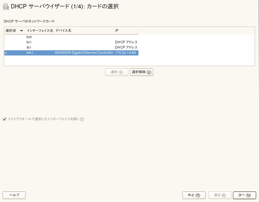 最初のステップでは、YaSTによりシステムで使用可能なネットワークインタフェースが検査され、リスト形式で表示されます。リストから、DHCPサーバがリスンするインタフェースを選択し、[]をクリックします。この後、[]を選択して、このインタフェース用のファイアウォールを開きます。詳細については、図 22-1を参照してください。