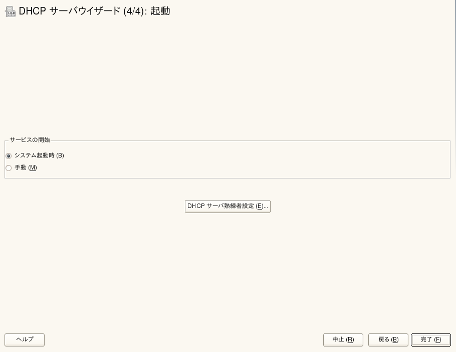環境設定ウィザードの3つ目の手順を終了すると、最後にDHCPサーバの起動方法を定義するダイアログが表示されます。ここでは、システムのブート時にDHCPサーバを自動的に起動するか、テスト時など必要に応じて手動で起動するかを指定します。[]をクリックして、サーバの環境設定を完了します。詳細については、図 22-4を参照してください。