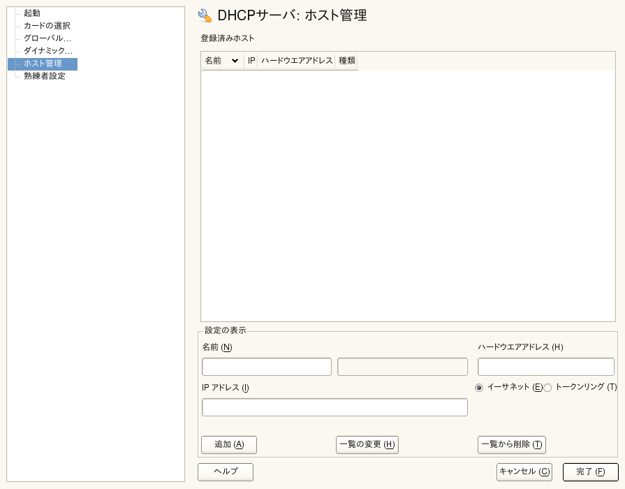 前のセクションで説明した方法で動的DHCPを使用するかわりに、アドレスを疑似静的方式で割り当てるようにサーバを設定することもできます。そのためには、下部のエントリフィールドを使用して、この方法で管理するホストのリストを指定します。具体的には、[]と[]に、この種のクライアントに与える名前とIPアドレスを指定し、さらに[]と[](トークンリングまたはイーサネット)を指定します。上部に表示されるクライアントリストを修正するには、[]、[]、および[]を使用します。詳細については、図 22-5を参照してください。