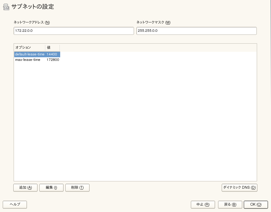 このダイアログでは、IPアドレスとネットマスクを使用して新しいサブネットを指定できます。ダイアログの中央部分で[]、[]、および[]を使用して、選択したサブネットのDHCPサーバ起動オプションを変更します。サブネットのダイナミックDNSを設定するには、[]を選択します。