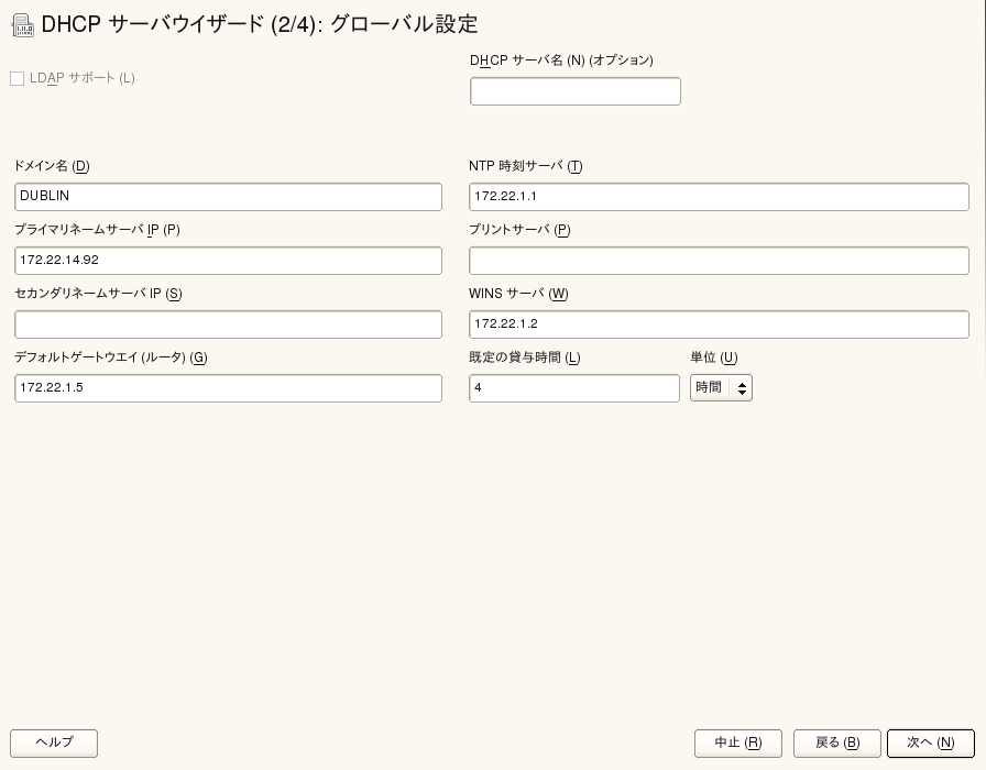 このバージョンのSUSE Linux Enterprise Serverでは、サーバの環境設定をローカルに(DHCPサーバを実行するホスト上に)保存したり、またはLDAPサーバに環境設定データを管理させるように、YaSTのDHCPモジュールを設定できます。LDAPを使用するには、LDAP環境を設定してから、DHCPサーバを設定してください。
