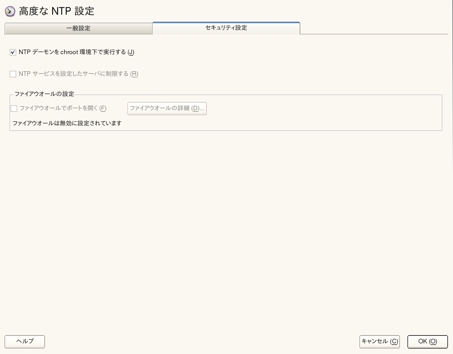 タブで、ntpdをchroot jailで起動するかどうかを指定します。デフォルトでは、が選択されています。このオプションは、攻撃によってシステム全体が危険な状態に陥ることを防ぐので、ntpdが攻撃された場合のセキュリティを強化します。