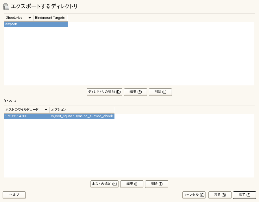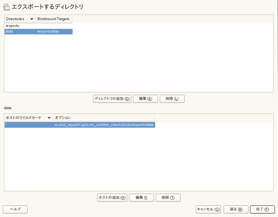 たとえば、サーバにアクセスするすべてのクライアントの疑似ディレクトリとして、/exportsを使用する場合を考えてみましょう。この場合、上部セクションでこのディレクトリを追加して、このディレクトリのオプションにfsid=0を指定します。別に/dataディレクトリもNFSv4を使ってエクスポートする必要がある場合は、このディレクトリも上部のセクションに追加します。このディレクトリに関するオプションを設定する際には、リストにbind=/exports/dataを指定します。また、/exports/dataがすでに/exportsの既存のサブディレクトリとなっていることを確認してください。オプションbind=/target/pathに対する変更は(追加、削除、値の変更など)、に反映されます。ディレクトリとその性質の概要を表示しているこの列は、直接編集することはできません。情報の入力が完了したら、をクリックして設定を終了します。サービスを再起動する場合は、をクリックしてください。