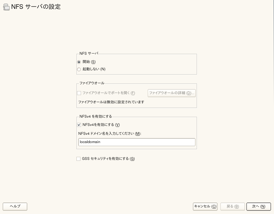 NFSv4を有効にしたら、適切なドメイン名を入力します。ここで指定する名前は、このサーバにアクセスするNFSv4クライアントの/etc/idmapd.confファイルで指定された名前にする必要があります。このパラメータは、NFSv4サポートに必要なidmapdサービスで使用されます(サーバとクライアントの両方で)。特に必要のない限り、そのままlocaldomain(デフォルト)を使用してください。詳細については、セクション 25.7, 詳細情報を参照してください。