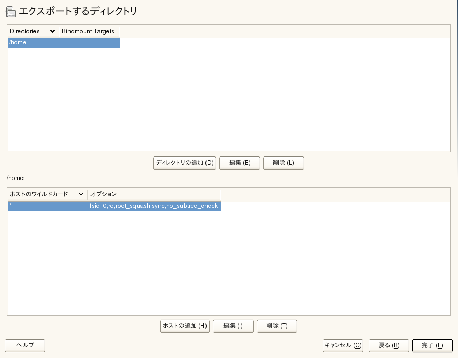 表示される小さなダイアログに、ホストを示すワイルドカードを入力してください。4種類の方法でホストを指定することができます。1台のホスト(名前またはIPアドレス)(single host)、ネットグループ( netgroups)、ワイルドカード(すべてのコンピュータがサーバにアクセスできることを示す*など)( wild cards)、およびIPネットワーク(IP networks)です。に、疑似rootにするディレクトリを設定する場合は、カンマ区切り形式のオプションリストにfsid=0を指定します。このディレクトリを、すでに疑似rootとして設定されているディレクトリ下のディレクトリにバインドする場合は、オプションリストにターゲットのバインドパスをbind=/target/pathの形式で指定します。