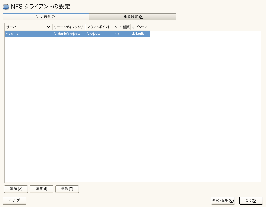 適切な権限があれば、NFSディレクトリをNFSサーバから自分のファイルツリーにマウントできます。これには、YaSTの[]モジュールを使用します。をクリックし、NFSサーバのホスト名、インポートするディレクトリ、およびディレクトリをローカルにマウントするマウントポイントを入力します。最初のダイアログでをクリックすると、変更が反映されます。
