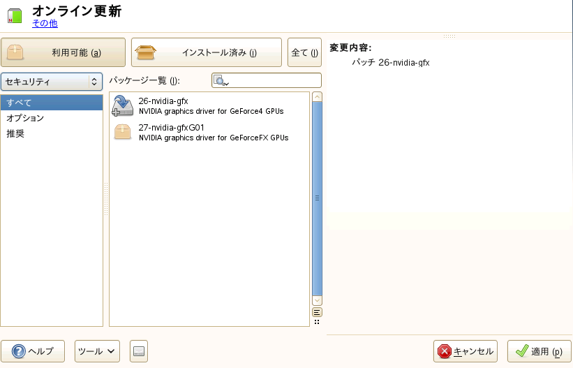 システムにインストールされたパッケージに適用される、まだインストールされていないパッチ。