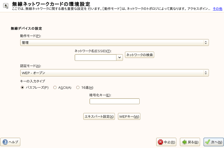 をクリックして、無線ネットワークカードの詳細設定ダイアログに進みます。NetworkManagerを使用している場合(詳細はセクション 17.5, NetworkManager参照)は、無線デバイスの設定を調整する必要はありません。これは、それらの設定がオンデマンドでNetworkManagerによって設定されるからです。とを使用して設定を完了します。コンピュータを特定の無線ネットワーク内でのみ使用する場合は、ここでWLAN操作の基本設定を行ってください。