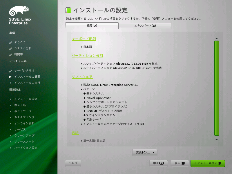 実際のインストール開始前の最後のステップで、YaST 推奨のインストール設定を変更し、今まで行った設定をレビューできます。基本設定はタブで変更でき、詳細オプションはタブで使用できます。提案を変更するには、をクリックして変更するカテゴリを選択するか、または見出しの1つをクリックします。これらのダイアログに示された項目を設定すると、常に、設定の変更に応じて更新されたインストール設定ウィンドウに戻ります。