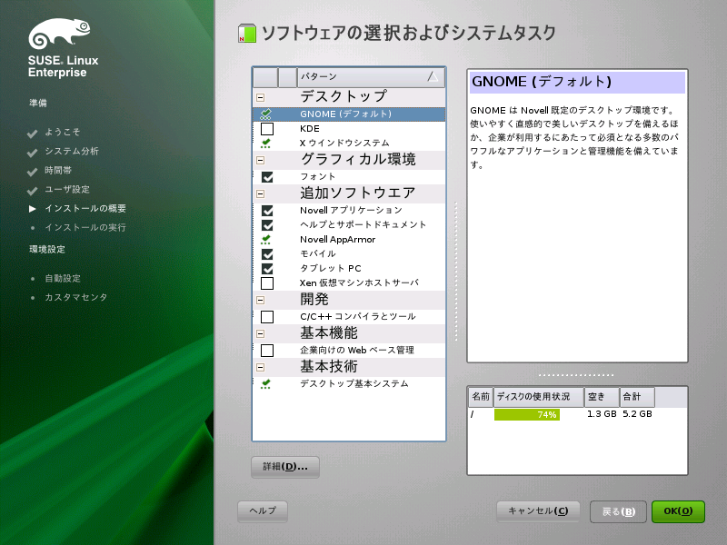 SUSE Linux Enterprise Serverには、各種の適用目的に使用する多数のソフトウェアパターンが含まれています。をクリックして、パターンの選択を開始し、必要に応じてインストールのスコープを変更します。リストからパターンを選択し、ウィンドウの右部分にパターン記述を表示します。各パターンには、個々の機能に必要なソフトウェアパッケージが多数含まれています(WebおよびLAMPサーバまたは印刷サーバ)。インストールするソフトウェアパッケージの選択の詳細については、を選択して、YaSTソフトウェアマネージャに切り替えます。