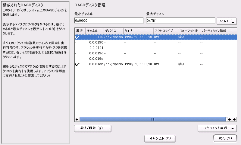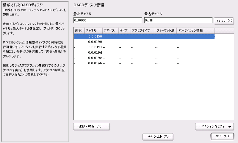の選択後、概要に利用可能なすべてのDASDが表示されます。使用可能なデバイスについて、より詳細な情報を取得するには、リストの上部にある入力フィールドを使用して、表示するチャンネルの範囲を指定します。指定した範囲に従ってリストをフィルタするには、を選択します。図 6-3を参照してください。