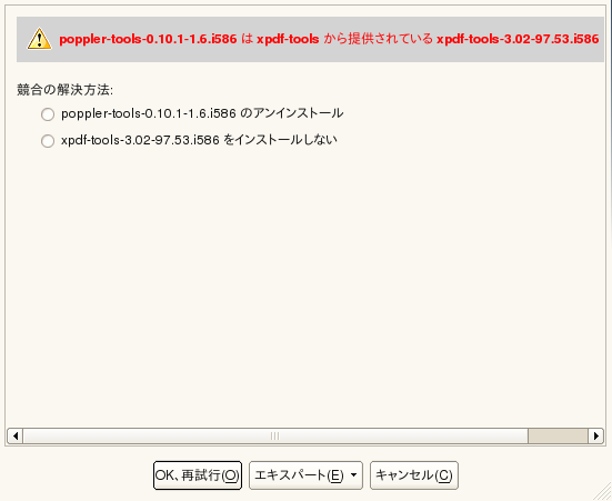 パッケージの競合を処理する場合、経験豊富な場合以外はYaSTの提案に従うようにお勧めします。提案を受け入れなかった場合、システムの安定性と機能性が存在する競合により失われる可能性があります。
