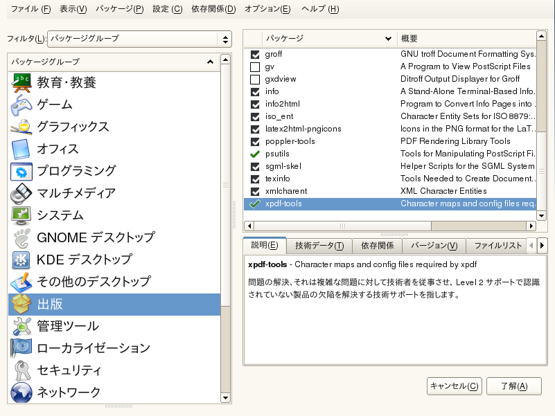 また、パッケージグループによりフィルタを適用します。パッケージグループ機能により、カテゴリ別にグループ化されたソフトウェアのより詳細なビューが得られます。パッケージが他のパッケージに依存する場合も少なくありません。パッケージを選択すると、潜在的なパッケージの依存関係を解決するために追加パッケージをインストールすることが求められる場合があります。