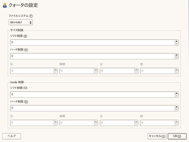 サイズまたはiノードに対して指定されたソフト制限をユーザまたはグループが既に超過している場合にのみ猶予間隔を定義できます。このソフト制限を超過していない場合は、時間に関連する入力フィールドは有効になりません。ユーザまたはグループが上記の制限セットを超過できる期間を指定します。