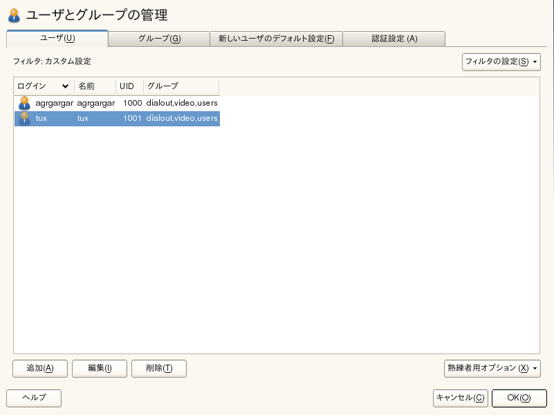 ユーザとグループの管理用に、このダイアログでは同様の機能が提供されます。ダイアログ上部にある適切なタブを選択することにより、ユーザとグループの管理ビューを簡単に切り替えることができます。