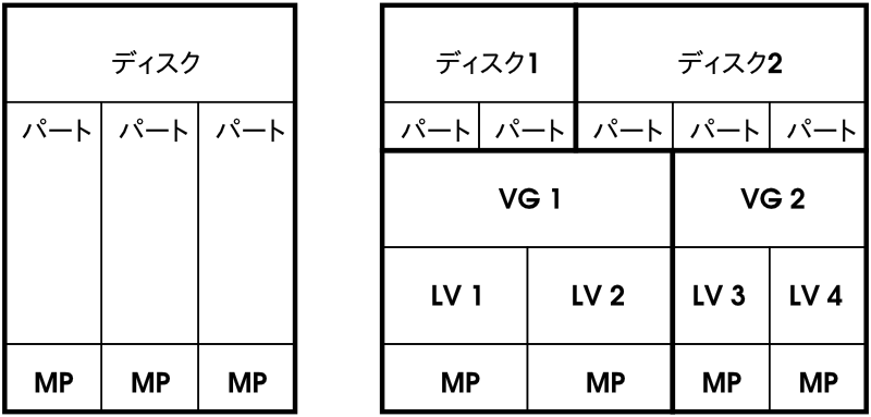 図 15-2では物理パーティショニング(左)とLVM区分(右)を比較しています。左側は、1つのディスクが割り当てられたマウントポイント(MP)をもつ3つの物理パーティション(PART)に分かれています。これによりオペレーティングシステムはそれぞれのパーティションにアクセスできます。右側では2つのディスクがそれぞれ3つの物理パーティションに分かれています。2つのLVMボリュームグループ(VG 1およびVG 2)が定義されています。VG 1にはDISK 1とDISK 2の2つのパーティションが含まれます。VG 2はDISK 2の2つのパーティションを除いた残り部分になります。LVMではボリュームグループに組み込まれた物理ディスクパーティションは物理ボリューム(PV)と呼ばれます。ボリュームグループ内に4つのLV(LV 1からLV 4)が定義されています。これらのボリュームは、それぞれに関連づけられたマウントポイントを介してオペレーティングシステムに使用されます。別のLVとの境界とパーティションの境界を並べる必要はありません。この例ではLV 1およびLV 2の間に境界があります。
