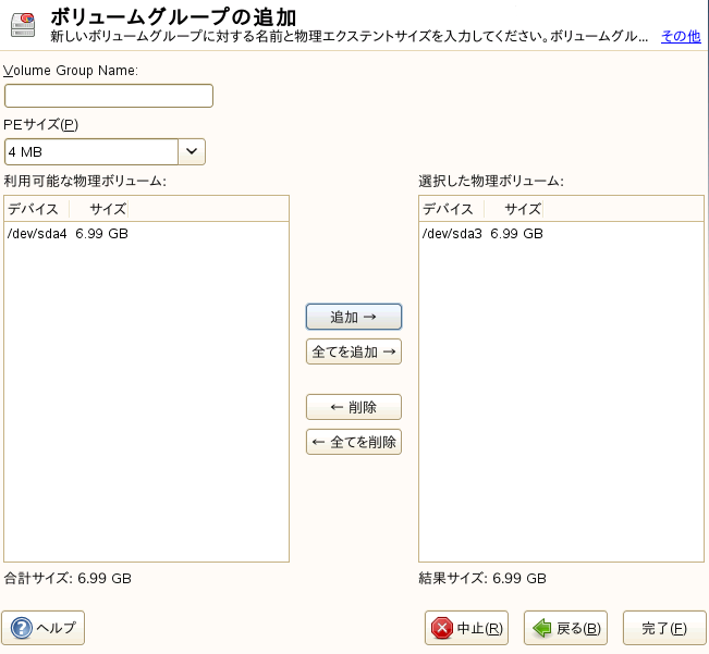 システムにまだボリュームグループが存在しない場合、ボリュームグループを追加する必要があります(図 15-3を参照)。で追加グループを作成できますが、通常はボリュームグループは1つで十分です。