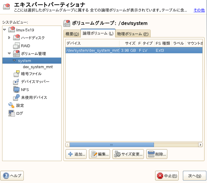 警告: LVMを使用することでデータ損失などの危険性が増加する恐れがあります。この危険性にはアプリケーションのクラッシュ、電源障害、誤ったコマンドなども含まれます。LVMまたはボリュームの再設定を実施する前にデータを保存してください。バックアップなしでは作業を実行しないでください。