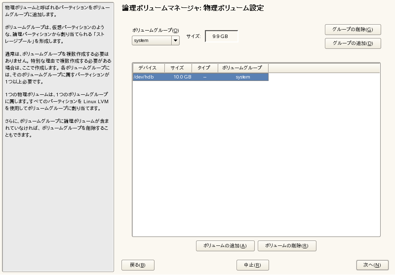 これまで未割り当てだったパーティションを、選択したボリュームグループに追加するには、まず、そのパーティションをクリックしてから[]をクリックします。この時点で、そのボリュームグループの名前が選択したパーティションの隣に入力されます。LVM用に予約されているパーティションをすべて1つのボリュームグループに割り当ててください。すべてのパーティションを割り当てないと、パーティションのスペースが未使用のまま残ります。ダイアログを終了する前に、すべてのボリュームグループを少なくとも1つの物理ボリュームに割り当てる必要があります。すべての物理ボリュームを割り当て終えた後、[]をクリックして論理ボリュームの設定に進みます。