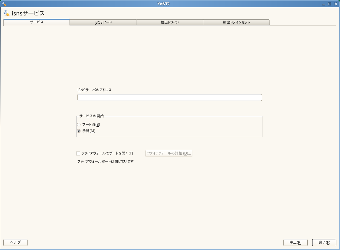 インストールが完了すると、iSNSサービスの設定ダイアログが、自動的に、[]タブを開いた状態で表示されます。