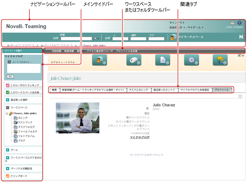 Novell Teamingインタフェースは、ワークスペースから構成されています。ワークスペースは、チームの目標、プロジェクト管理の目標など、特定の目標を達成する上で役立つ領域です。最初にTeamingを起動すると、パーソナルワークスペースが表示されます。これには、以下のツールバーや機能が含まれます。