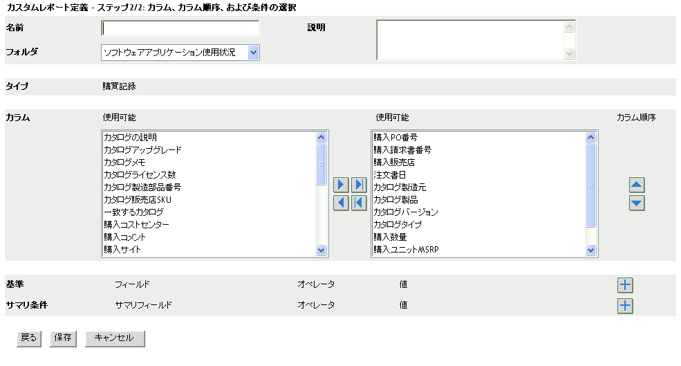 列: 左側にあるリストからレポートに含めるデータを選択します。矢印アイコンを使用して、選択したデータを右側のリストに移動します。複数のオプションを同時に選択するには、<Ctrl>キーを押しながらクリックします。上下アイコンを使用してデータの表示方法を配列します。