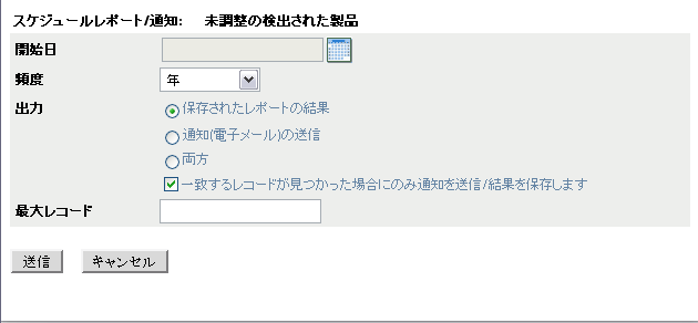 出力: レポートを保存するか、レポートの準備ができたことを知らせる電子メール通知を送信するか、または両方を選択します。結果を保存するか、または一致したレコードが検出されたときにのみ通知を送信するかを選択することもできます。電子メールアドレスの設定の詳細については、セクション 6.2.5, 通知を送信する電子メールアドレスの設定を参照してください。