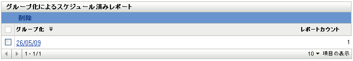 [グループごとのスケジュール済みレポート]ページが開き、日付またはタイトルでグループ化された保存済みのスケジュール済みカスタムレポートとレポート件数が表示されます。日付またはタイトルをクリックして、レポートの選択や表示ができる[]ページを開きます。レポートのグループを削除するには、グループを選択して[]をクリックします。