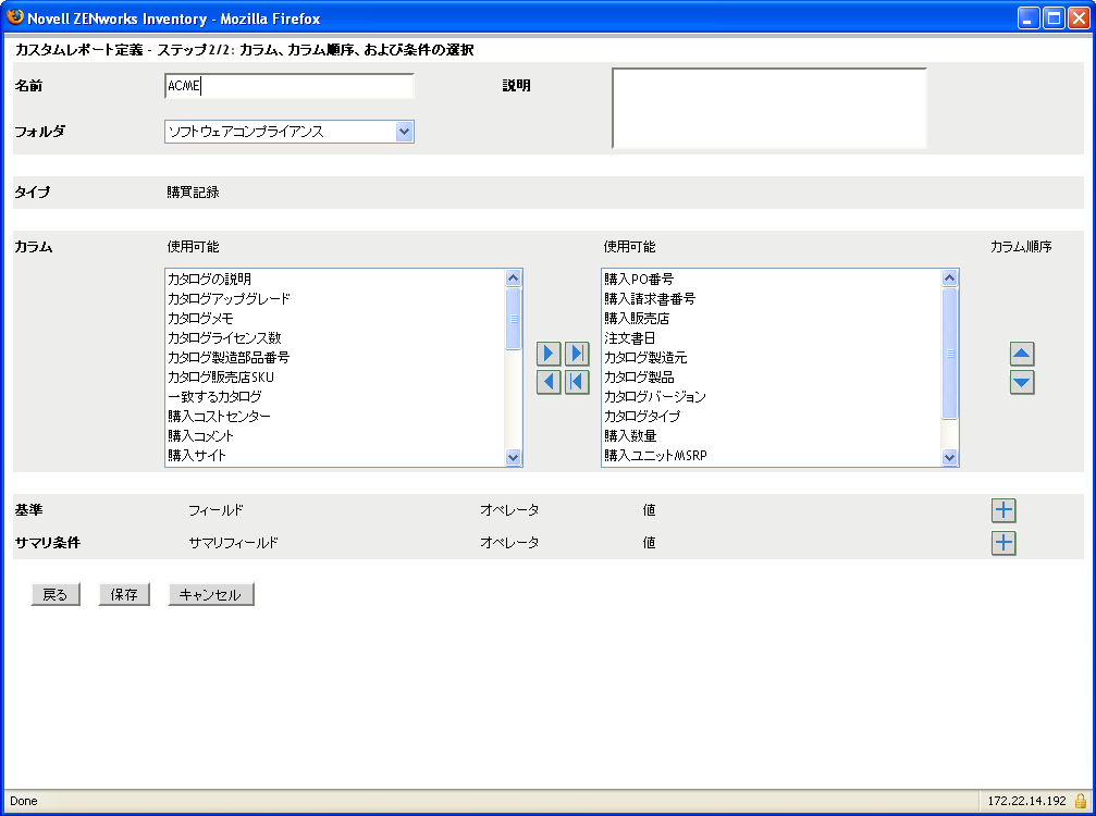 列: 左側にあるリストからレポートに含めるデータを選択します。矢印アイコンを使用して、選択したデータを右側のリストに移動します。複数のオプションを同時に選択するには、<Ctrl>キーを押しながらクリックします。上下アイコンを使用してデータの表示方法を配列します。