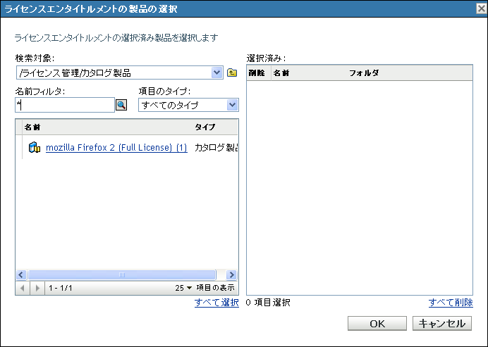 [ライセンスエンタイトルメントの製品の選択]ダイアログボックスで、カタログ製品を選択します。
