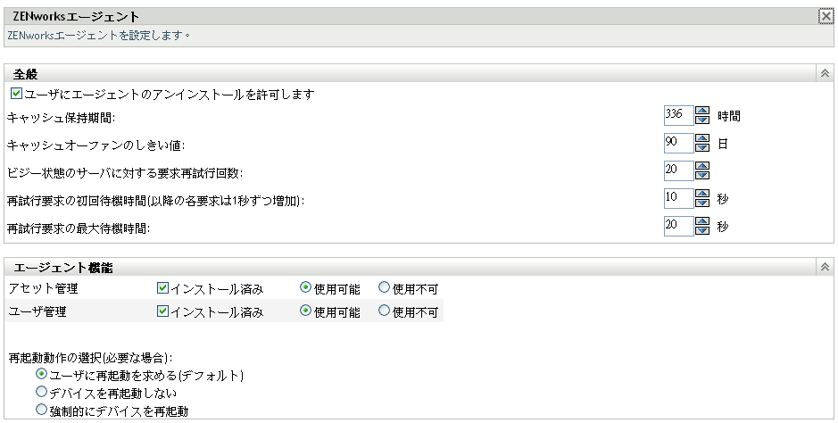 既存エージェントの設定の上書きおよび構成の詳細については、『ZENworks 10 Asset Managementシステム管理リファレンス』の「展開後のAdaptive Agentの設定」を参照してください。