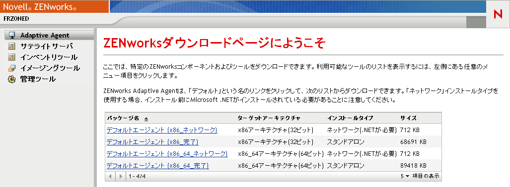 ネットワーク: ネットワークパッケージは、Preagentだけをダウンロードし、目的のデバイスにインストールします。続いて、PreagentがZENworksサーバからZENworks Adaptive Agentをダウンロードしてインストールします。