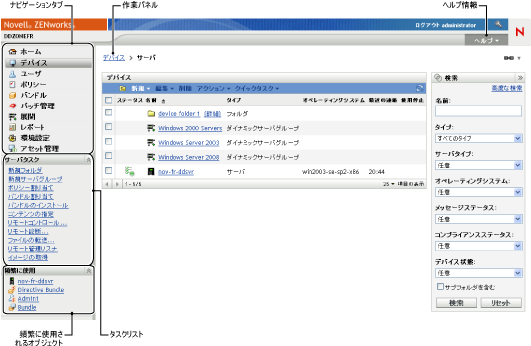 作業パネル: 作業パネルでは、ZENworksシステムの管理および監視を行います。パネルは、現在のページによって異なります。上の例では、[]と[]という2つの作業パネルがあります。[]パネルには、サーバ、フォルダ、サーバグループ、作成されたダイナミックサーバグループのリストが表示されます。このパネルはサーバの管理に使用します。[]パネルでは、サーバ名、オペレーティングシステム、ステータスなどの条件に従って[デバイス]パネルをフィルタリングできます。