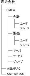 ユーザソースとしてLDAPディレクトリに接続すると、ディレクトリ内にある公開するコンテナを定義できます。定義するユーザコンテナの数は、ディレクトリをどれぐらい公開したいかに応じて決まります。次に例を示します。