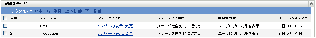 展開ステージのシークエンスを並べ替える必要がある場合、ステージを選択し、[]または[]をクリックします。