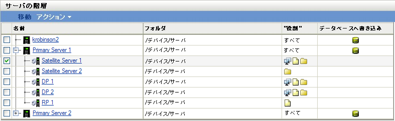 1つ以上の役割を有効にした場合、[]カラムの[サーバの階層]パネルに[サテライトの役割]アイコンが追加されます。