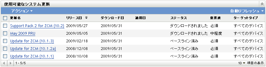 ZENworksのインストールに対する、システム更新の相対的重要度が表示されます。可能なエントリは次のとおりです。 OPTIONAL: ZENworks の通常動作には不要。 MANDATORY: 適用が必要な必須の更新。 |