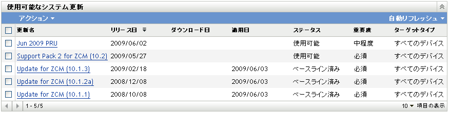 ZENworksコントロールセンターの左側のペインで[]をクリックし、[]タブをクリックし、[使用可能なシステム更新]パネルを表示します。