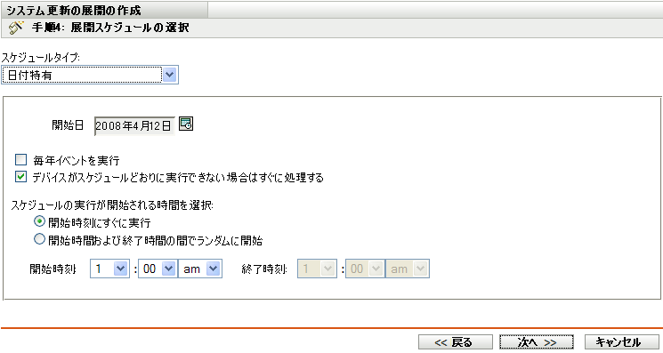 開始時刻にただちに開始: 指定した開始時刻に、更新を展開できます。