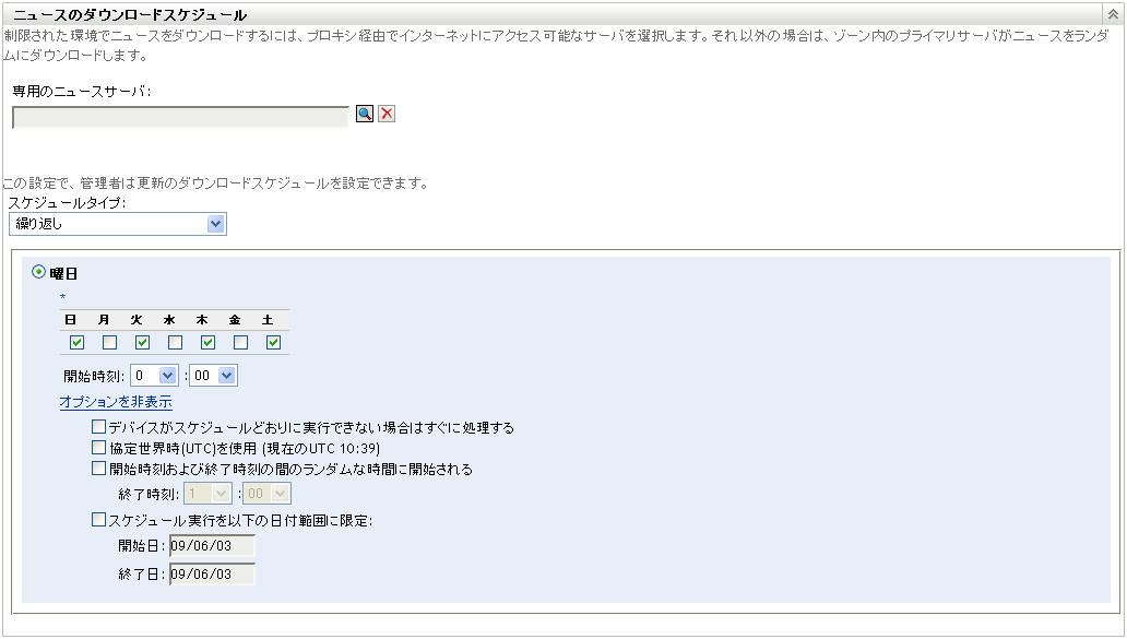[ZENworksニュースの設定]ページでは、専用のニュースサーバとZENworksニュースをダウンロードするスケジュールを設定できます。デフォルトでは、ニュースは、管理ゾーンのプライマリサーバによって真夜中にダウンロードされます。