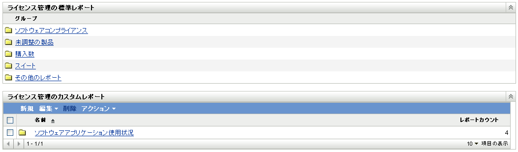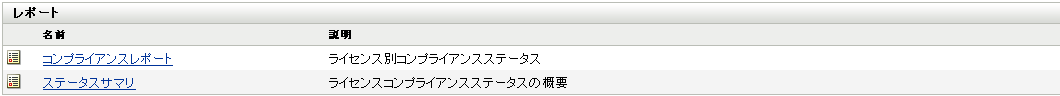 ZENworksコントロールセンターには、多くの事前定義済みレポートが付属しており、管理ゾーンにおけるソフトウェアコンプライアンスを分析する場合に使用できます。これらのレポートは機能別にグループ分けされます。利用可能なレポートは次のとおりです。