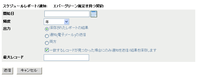出力: レポートを保存するか、レポートの準備ができたことを知らせる電子メール通知を送信するか、または両方を選択します。結果を保存するか、または一致したレコードが検出されたときにのみ通知を送信するかを選択することもできます。電子メールアドレスの設定の詳細については、セクション 6.2.5, 通知を送信する電子メールアドレスの設定を参照してください。