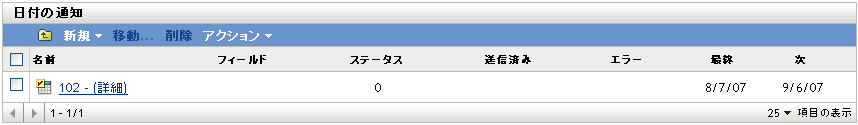 [日付の通知]ページには、契約の作成時に設定した日付の通知が表示されます。既存の通知をクリックすると、電子メール設定を表示または編集できます。