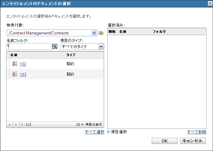 2. [エンタイトルメントのドキュメントの選択]ダイアログボックスで契約を指定し、[OK]をクリックします。