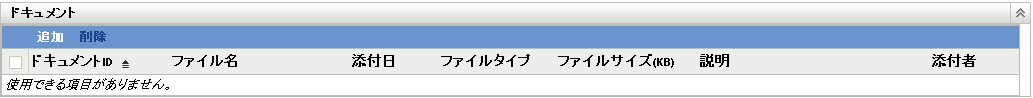 []タブには、契約に関連する既存のドキュメントが表示されます。また、このタブで、ドキュメントを追加することができます。