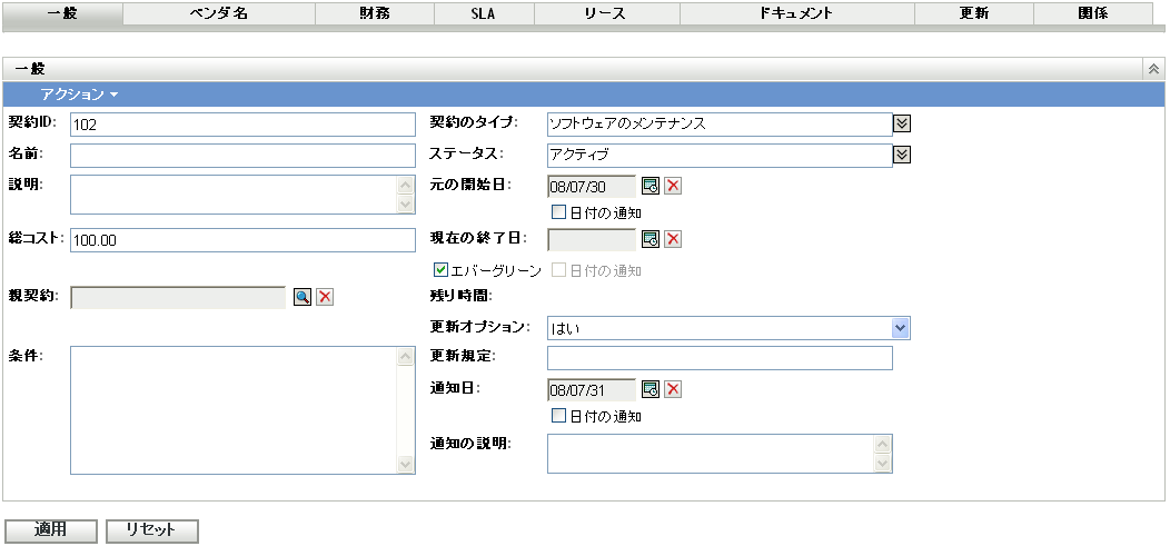 []タブは、契約の一般情報です。これは、新規契約の作成ウィザードで作成した情報です。これらのフィールドは直接編集できます。